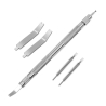 Para um conforto ótimo de utilização, existem três pontas intercambiáveis: uma cabeça plana e angular, uma cabeça de dentes finos e uma ponta de pinça. A pega ranhurada oferece uma aderência firme e antiderrapante e é adequada para todos os tamanhos de braceletes de relógio com bombas.